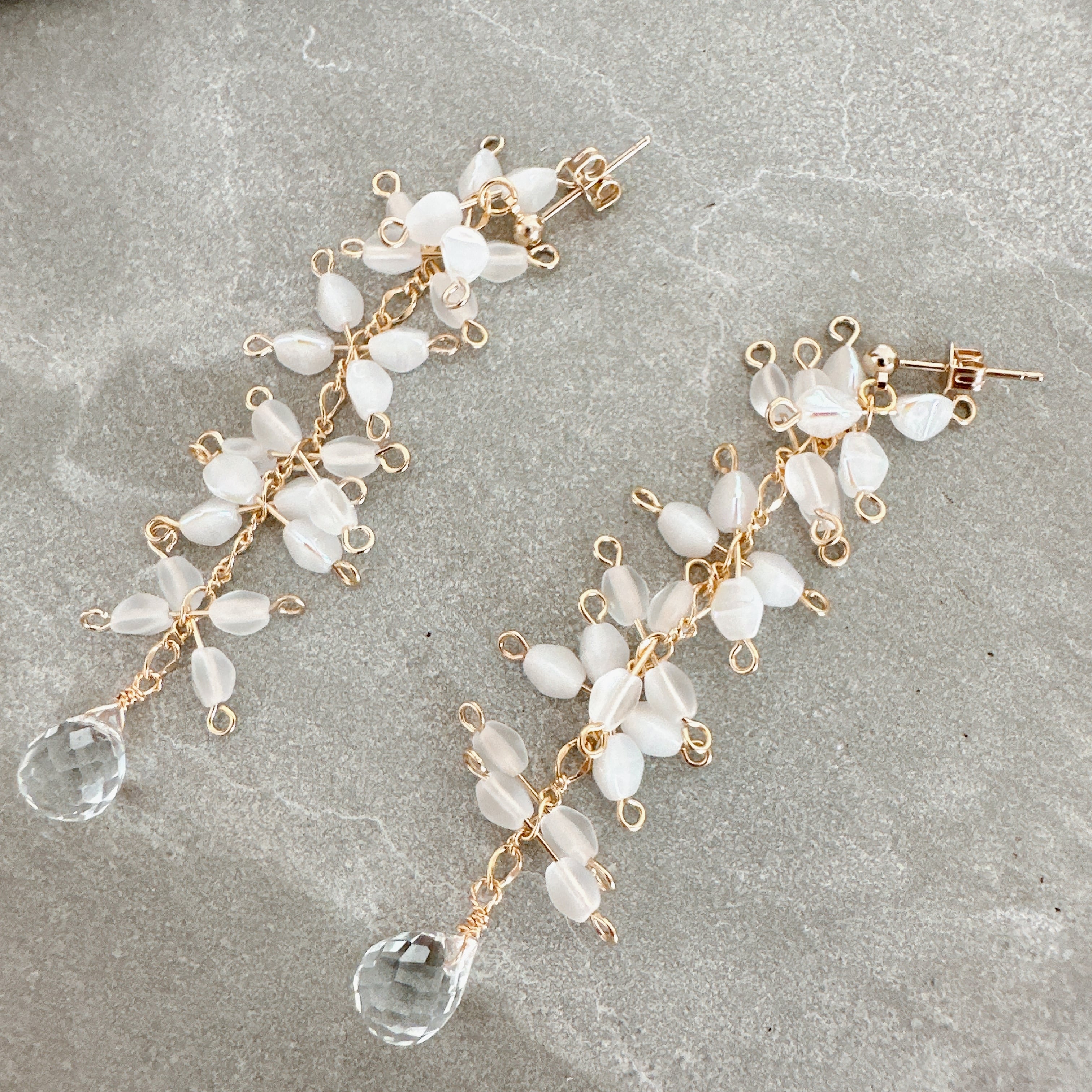 ホワイト×クリアの花の蔓デザインは少し個性的ですが、不思議とどんなコーディネートにもぴったりマッチします。他には無いおしゃれなイヤージュエリーです。